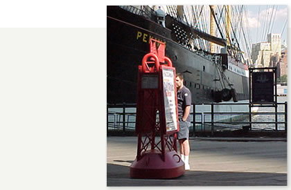The challenge was to develop a coherent outdoor signage system for a small, scatter-site museum located in a busy, mixed-use historic district where a strong retailing presence had overwhelmed the museum’s identity. As project manager, I hired environmental designer Lance Wyman from a field of several candidates. We developed new branding — colors, typefaces, and signage types — inspired by the museum’s waterfront location and collection of ships. To heighten the institution’s visibility, I requested that Lance develop a new logo that privileged the word “museum,” and that utilized historic wooden type from the museum’s print shop. I wrote an interpretive script (prototyped but not implemented) that linked the museum’s ships to the landside buildings and exhibits, as well as copy for informational “buoy boards,” which were strategically deployed throughout the district.