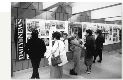 Originally organized for display at Daily News building, then located at 220 East 42nd Street, the exhibit featured photographs, arranged thematically, of 42nd Street, selected from the Daily News archives. Following its run at the News building, I negotiated a transfer to the MTA’s Arts for Transit space, in the subway station at 42nd Street and Sixth Avenue, where the exhibit remained on view for several months.